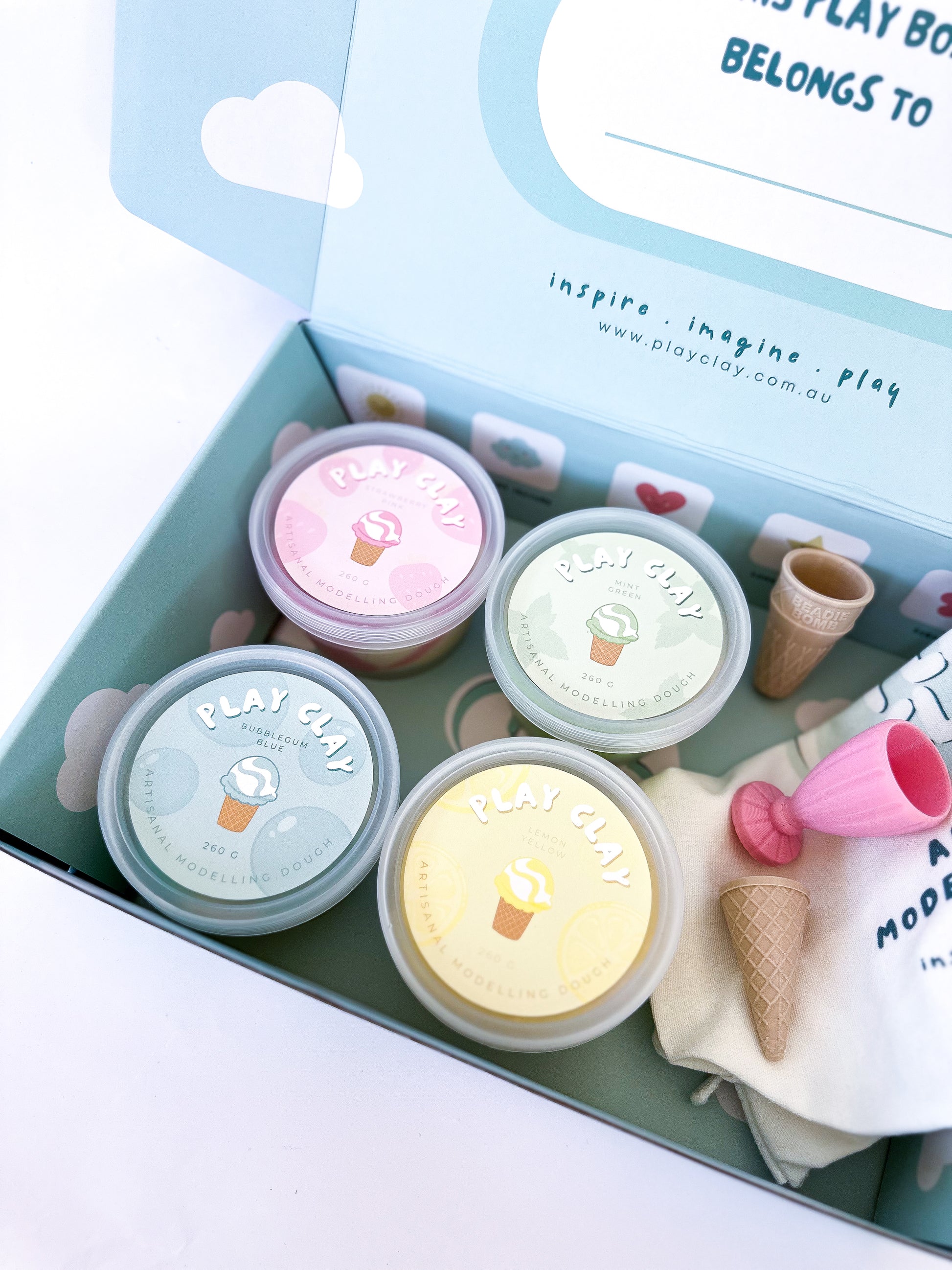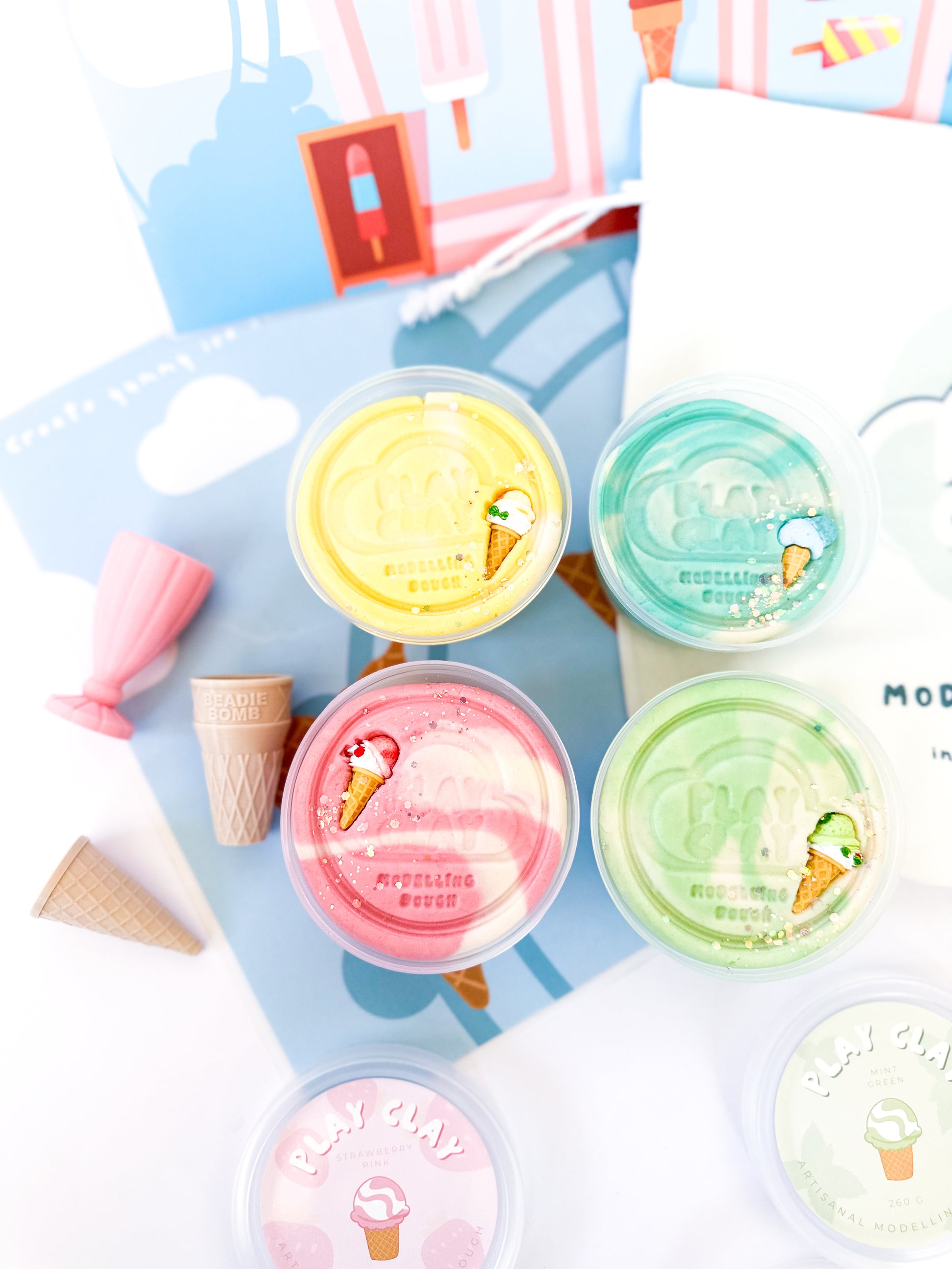The ultimate Gelato playdough kit that includes four large playdough tubs (260g) and three beautiful Beadie Bug 3D printed cones to create an imaginative gelateria. Customize your kit further by adding additional Beadie Bug items or a rolling pin to your playdough kit.